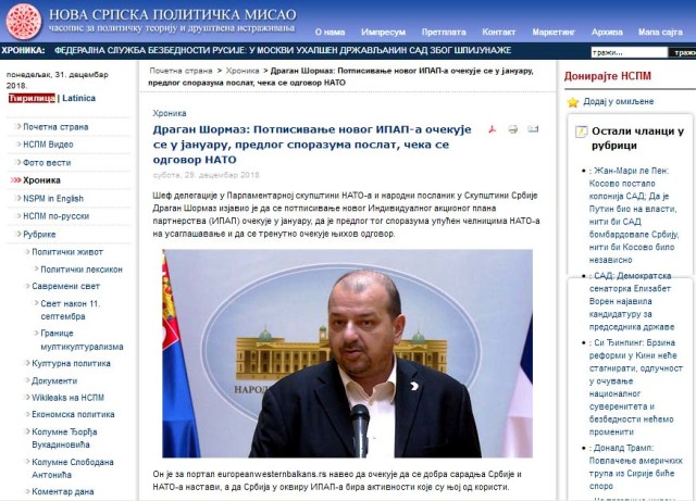 Šéf delegácie Srbska v Parlamentnom zhromaždení NATO a poslanec srbského parlamentu Dragan Šormaz uviedol, tento mesiac by Srbsko malo podpísať nový Individuálny plán partnerstva s NATO – IPAP (Individual partnership action plan). Domáce médiá uvádzajú, že Srbsko v súvislosti s plánovaným podpisom tejto dohody poslalo svoje návrhy vedeniu NATO a očakáva sa, že onedlho dostane odpoveď