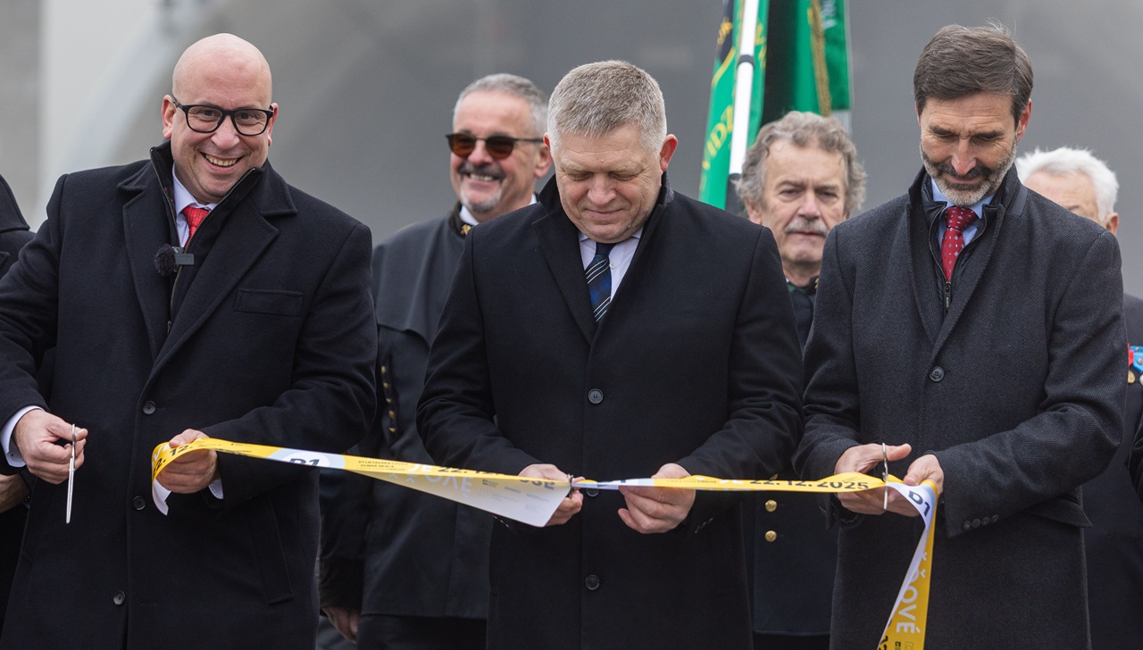 Na snímke v popredí zľava prestrihávajú pásku minister dopravy SR Jozef Ráž ml. (nominant Smer-SD), predseda vlády SR Robert Fico (SMER-SD) a minister zahraničných vecí a európskych záležitostí SR Juraj Blanár (Smer-SD) počas slávnostného otvorenia nového diaľničného úseku D1 Lietavská Lúčka – Dubná Skala, ktorého súčasťou je aj tunel Višňové / Foto: TASR-Daniel Stehlík