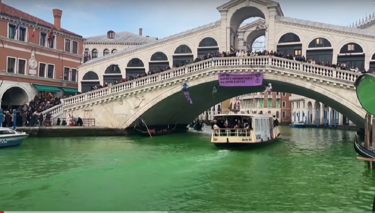 Klimatická aktivistická skupina Extinction Rebellion sa prihlásila k zodpovednosti za prekonanie slávneho mosta Rialto v Benátkach a vypustenie chemického farbiva do historického kanála Grand Canal, ktorý sa pod protestným transparentom zmenil na fluorescenčne zelený : „Kým vláda diskutuje, my visíme na vlásku.“
