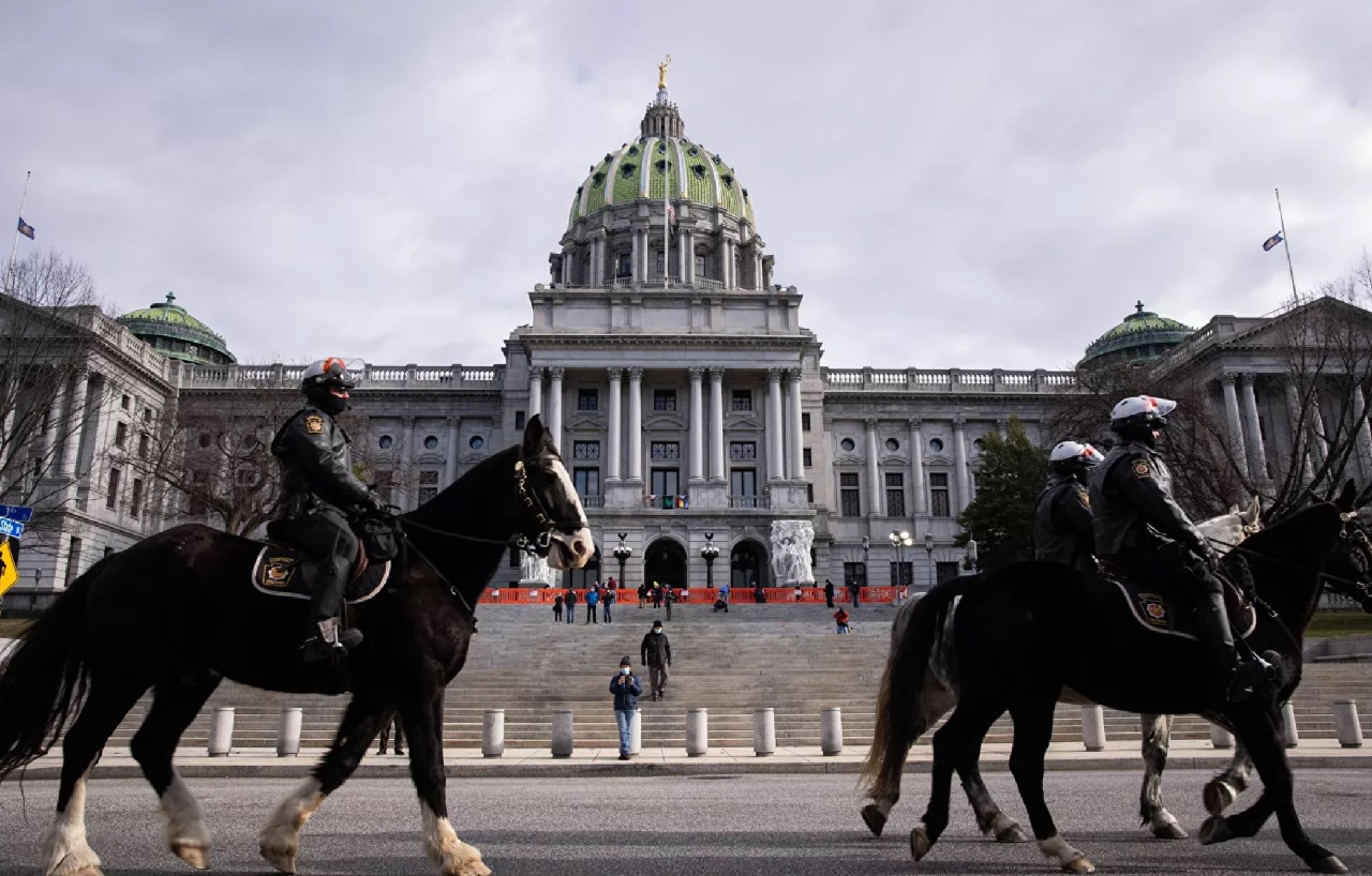 Policajti hliadkujú neďaleko budovy Kapitolu štátu Pensylvánie v Harrisburgu