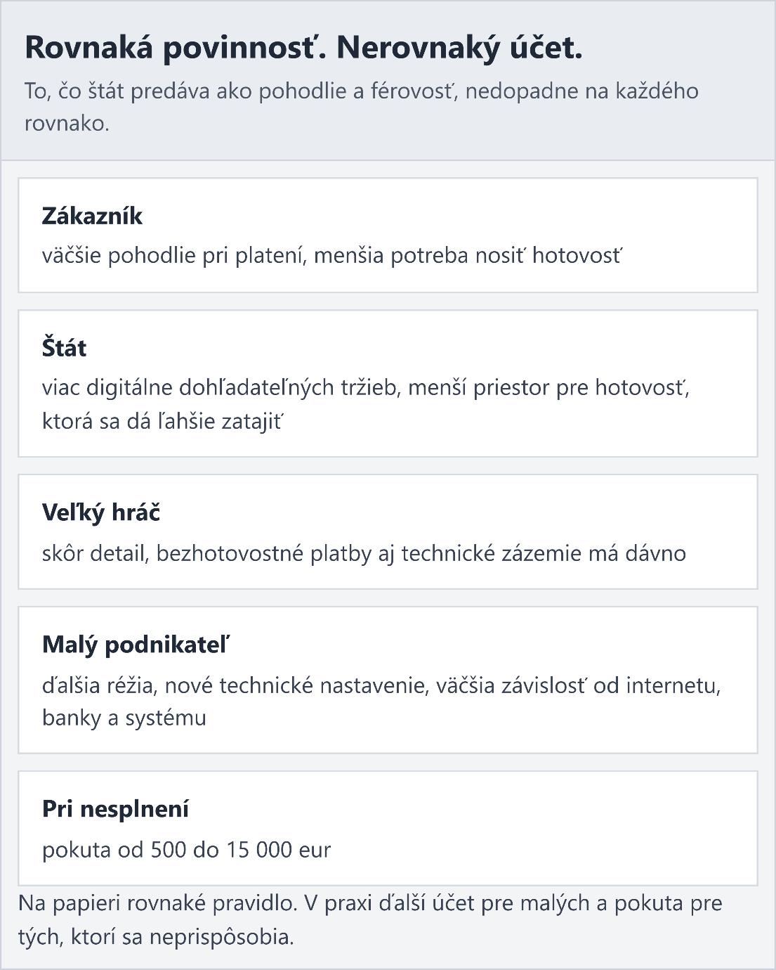 Pre malého živnostníka, remeselníka alebo menšiu prevádzku je to však ďalšia réžia navyše. Musí zistiť, čo presne sa od neho chce, vybrať si riešenie, nastaviť ho a udržať v chode. Musí sa spoliehať na internet, signál, mobil, banku aj pokladničný systém. A to všetko kvôli povinnosti, ktorú veľký sotva pocíti.