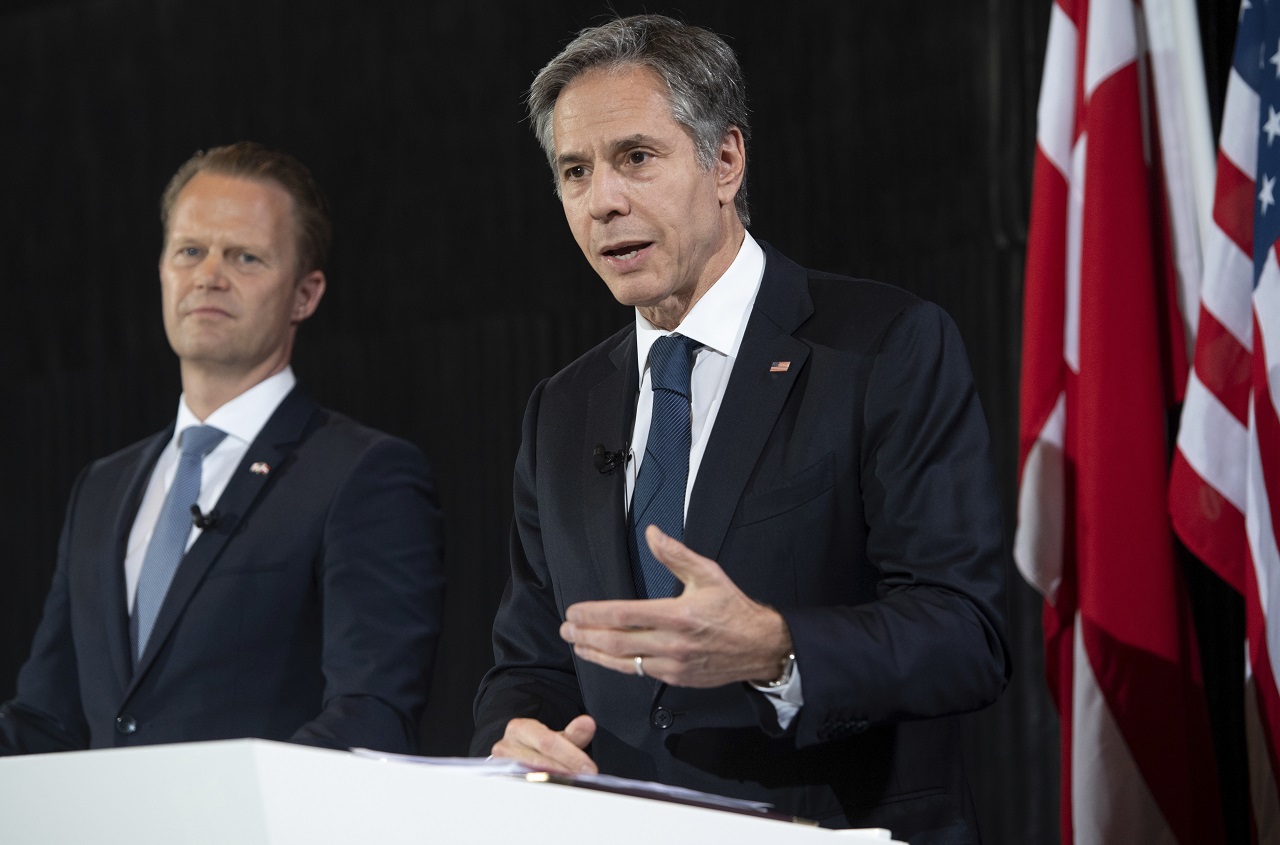 Na snímke sprava americký minister zahraničných vecí Antony Blinken a dánsky minister zahraničných vecí Jeppe Kofod