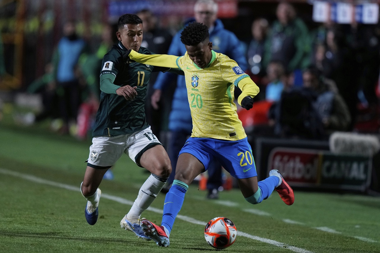 Na snímke futbalista Estevao z Brazílie (vpravo) a hráč Bolívie Roberto Fernandez v súboji o loptu počas kvalifikačného zápasu MS2026 Bolívia – Brazília / Foto: TASR/AP-Juan Karita