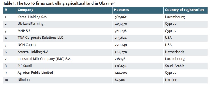 Podľa správy Oakland Institute („War and Theft: The Takeover of Ukraine’s Agricultural Land“) z roku 2023 sa po zrušení moratória na predaj pôdy v roku 2021 začali obrovské konsolidácie pôdy prostredníctvom veľkých agroholdingov a finančných fondov. Mnohé z nich sú prepojené na zahraničný kapitál, vrátane západných investičných skupín, ktoré získali prístup k ukrajinským pôdam cez leasingy a dlhodobé nájomné zmluvy.