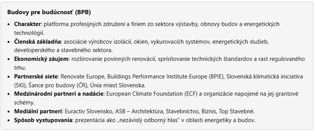 Platforma Budovy pre budúcnosť sa na verejnosti prezentuje ako odborný hlas stavebníctva a energetiky. Nie je teda občianskym združením v zmysle zastupovania jednotlivcov či domácností. Združuje profesné organizácie, priemyselné asociácie a firmy pôsobiace v oblasti výstavby, obnovy budov a energetických technológií. Je hlasom výrobcov izolácií, producentov okien, firiem poskytujúcich energetické služby, tepelných čerpadiel, klimatizačných systémov a ďalších ekonomických beneficientov zelenej transformácie. Jej základňu dopĺňajú technické univerzity a partneri zo stavebného trhu. To je legitímne a v rámci záujmovej demokracie aj prirodzené.