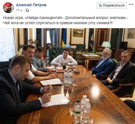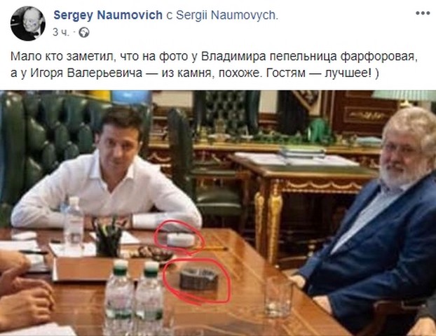 Ďalší človek z táboru Petra Porošenka Alexej Petrov sarkasticky poznamenal: „Je to nová hra „Skús si nájsť prezidenta.“ Bloger Sergej Naumovič si všimol, ako si Zelenskyj váži a bojí sa Kolomojského: „Pozrite sa. Málo kto si všimol, že prezident Zelenskyj má vedľa seba obyčajný porcelánový popolník, ale Kolomojskij má popolník z drahého kameňa. Nuž, pre dôležitých hostí vždy to lepšie…“