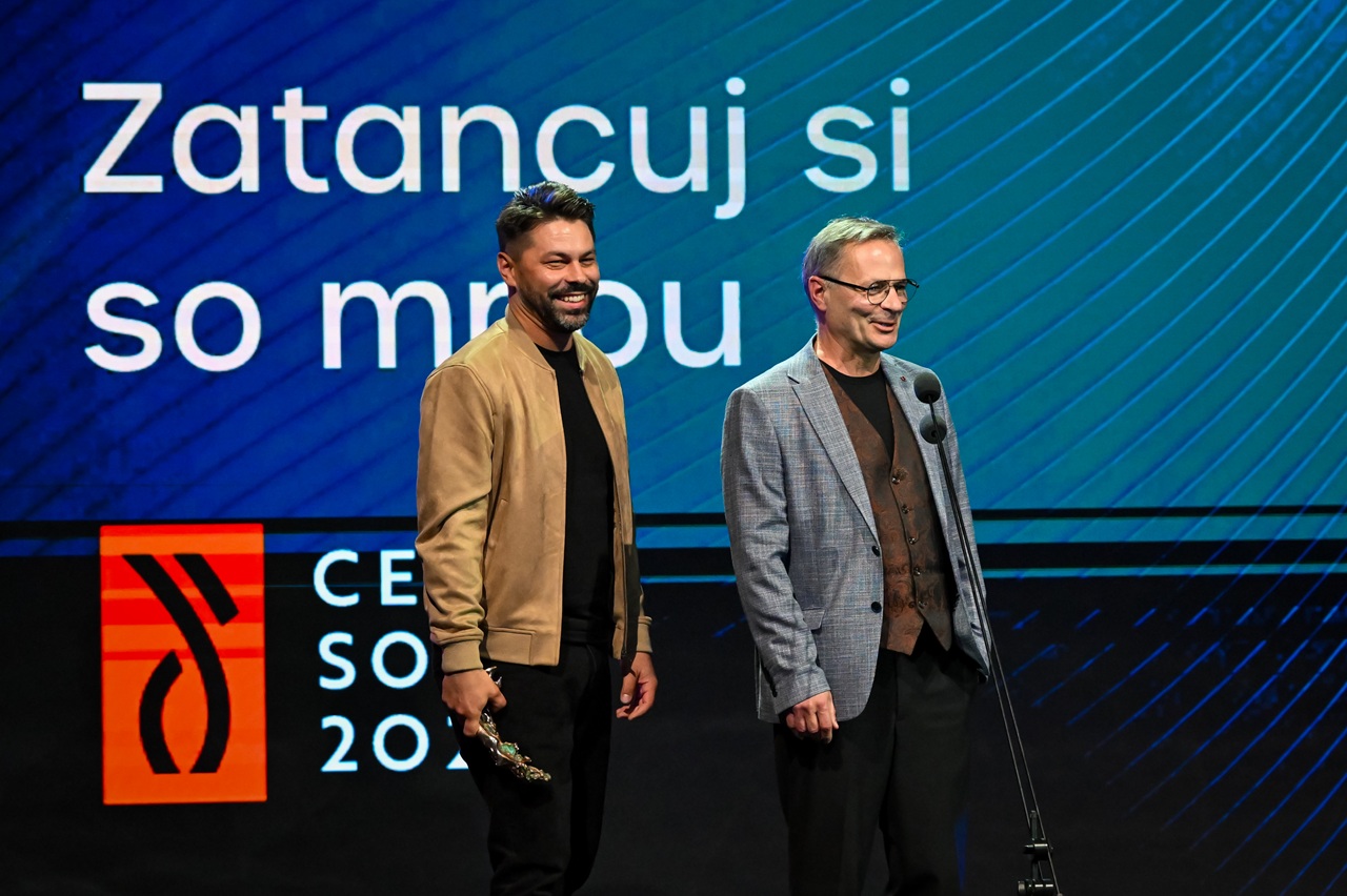 Na snímke spevák Adam Ďurica (vľavo) a textár Vladimír Krausz (vpravo) si preberajú cenu SOZA v kategórii Najhranejšia skladba v online za pieseň Zahrajte si so mnou / Foto: TASR-Pavol Zachar
