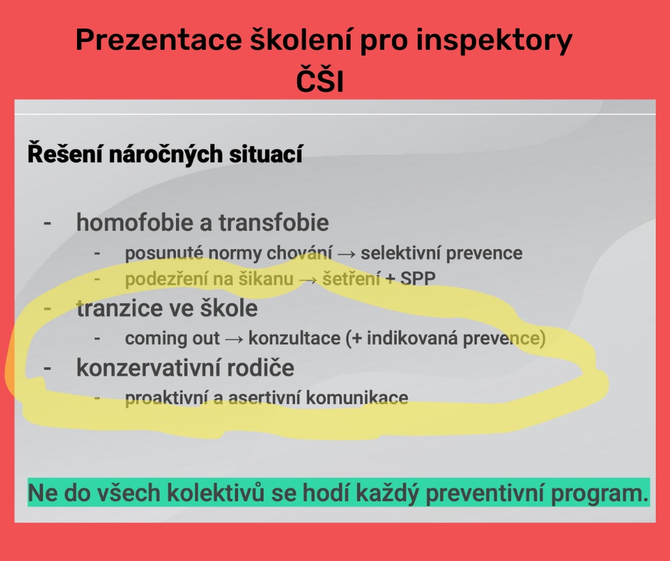 Inspektoři České školní inspekce (ČŠI) byli povinně proškoleni neziskovou organizací Prague Pride. ČSI je oficiální správní orgán, který má vykonávat nezávislou inspekční činnost ve školství a na základě podnětů řešit i stížnosti rodičů. Tato jasně lobbistická skupina, která ještě před pár lety ústy svého zástupce tvrdila v České televizi, že nemá absolutně žádnou ambici zasahovat do školství, prorůstá nyní bezprecedentním způsobem do školství i do státní správy