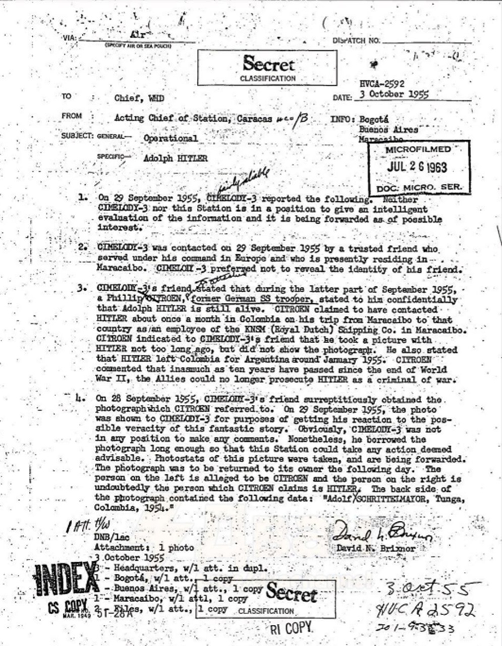 Napriek potvrdeniu Hitlerovej smrti v roku 1945 strávili americkí agenti nasledujúce desaťročie jeho hľadaním v Južnej Amerike. Z dokumentov CIA vyplýva, že v roku 1955 dostal agent s krycím menom CIMELODY-3 fotografiu, na ktorej bol údajne Adolf Hitler na pláži v Kolumbii pod menom Adolf Schrittelmayor.