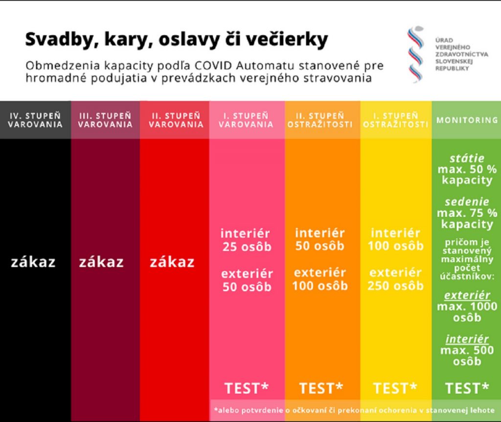 Od 17. mája 2021 sú nastavené aj kapacitné obmedzenia počtu účastníkov v závislosti od zaradenia okresu podľa COVID Automatu pre oslavy, kary a svadby.