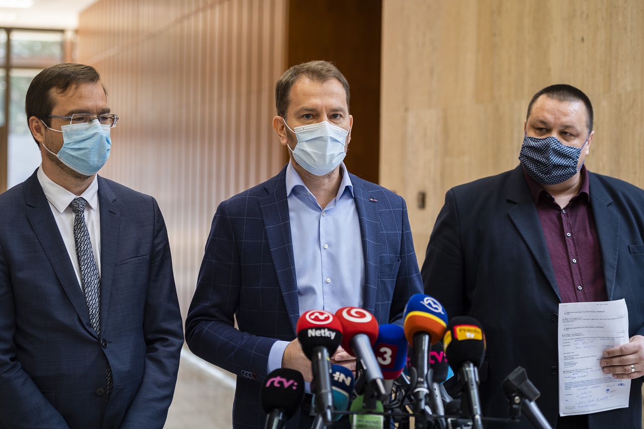 Na snímke zľava minister zdravotníctva SR Marek Krajčí, predseda vlády SR Igor Matovič (obaja OĽaNO) a hlavný hygienik SR Ján Mikas