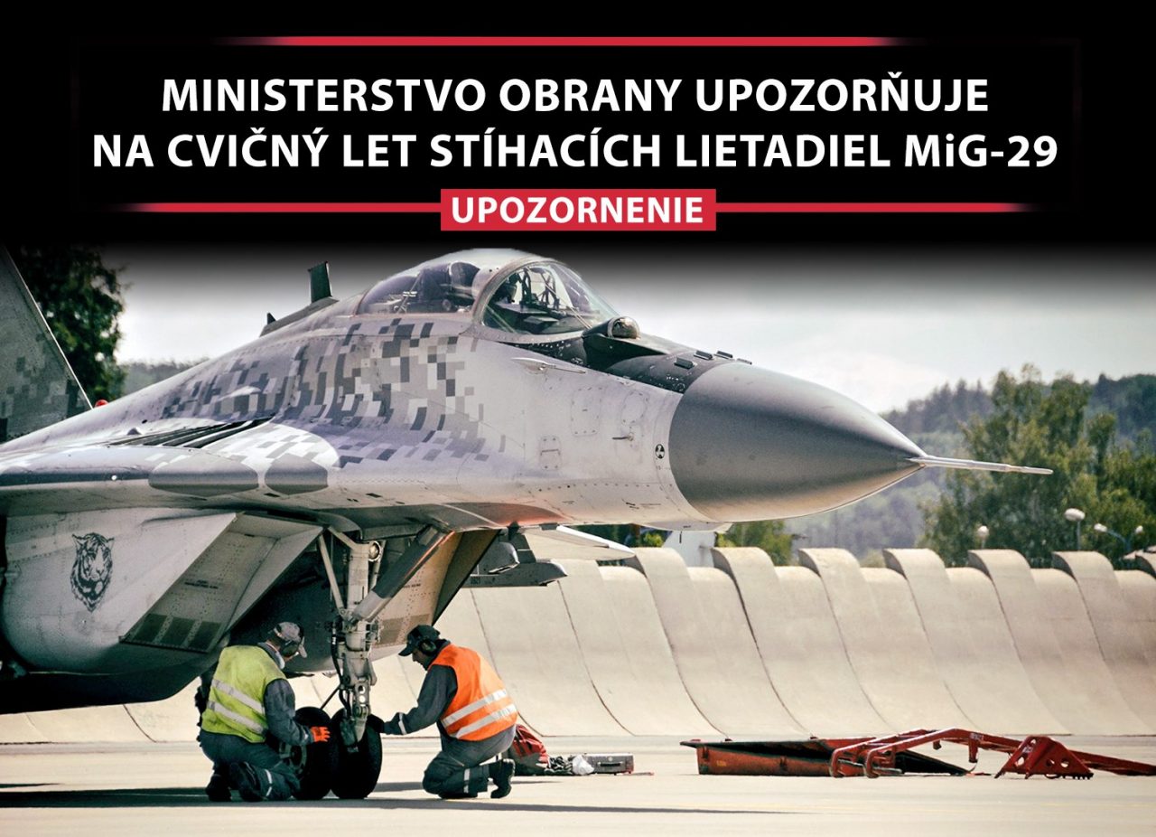 Ministerstvo obrany (MO) SR upozorňuje verejnosť, že v rámci plánovaných letov budú dnes cca o 10.00 h na trase Sliač – Liptovský Mikuláš – Javorina – Kysak – Tisovec – Sliač prelietavať nadzvukové stíhacie lietadlá MiG–29 Vzdušných síl OS SR. Je možné, že v danej oblasti sa vyskytne rázová vlna – silný zvuk podobný výbuchu, ktorý bude spôsobený prekonaním rýchlosti zvuku stíhacími lietadlami