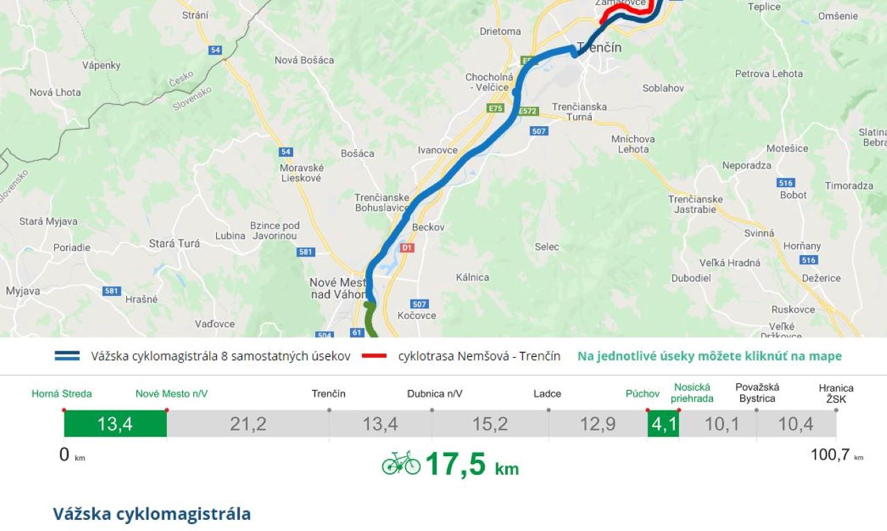 Cyklotrasa Trenčín – Nové Mesto nad Váhom je v poradí tretím s ôsmich úsekov Vážskej cyklomagistrály. Cyklisti už aktívne využívajú viac ako 13-kilometrový úsek medzi Hornou Stredou a Novým Mestom nad Váhom a tretí rok aj štvorkilometrové prepojenie Púchova s Nosickou priehradou. Po kompletnom dobudovaní bude Vážska cyklomagistrála merať 100 kilometrov a spojí hranice Trenčianskeho kraja so Žilinským a Trnavským krajom.