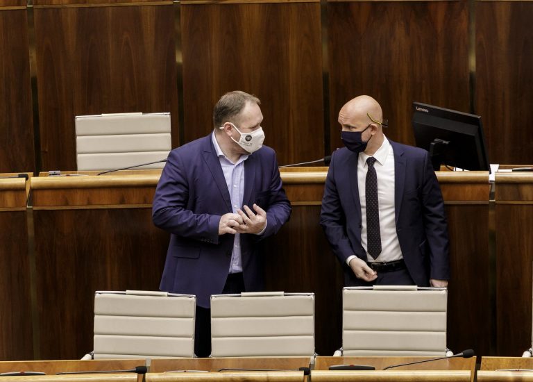 Na snímke sprava minister školstva, vedy, výskumu a športu SR Branislav Gröhling a poslanec Richard Vašečka (OĽaNO) počas 16. schôdze NR SR v Bratislave 3. novembra 2020