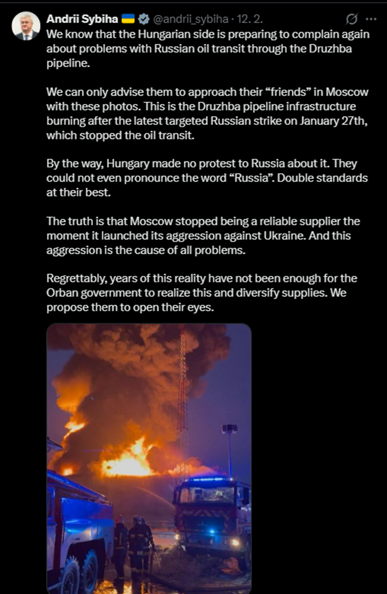 „Vieme, že maďarská strana sa chystá opäť sťažovať na problémy s tranzitom ruskej ropy cez ropovod Družba. Môžeme im len odporučiť, aby sa s týmito fotografiami obrátili na svojich „priateľov“ v Moskve,“ uviedol Sybiha na X a príspevok doplnil  o fotografie.