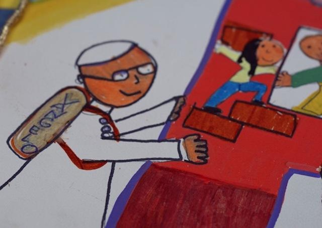 Obrázok zobrazuje pápeža Leva v okuliaroch s batohom na chrbte, na ktorom je nápis Vangelo (Evanjelium), ako sa chystá na cestu spolu s deťmi. Na kresbe je vidieť, ako deti ukladajú stavebné kocky, čo ich vykresľuje ako „budovateľov pokoja“. Ide o dojímavý odkaz, ktorým chceli mladí pacienti vyjadriť podporu Svätému Otcovi na začiatku jeho cesty do Alžírska, Kamerunu, Angoly a Rovníkovej Guiney.