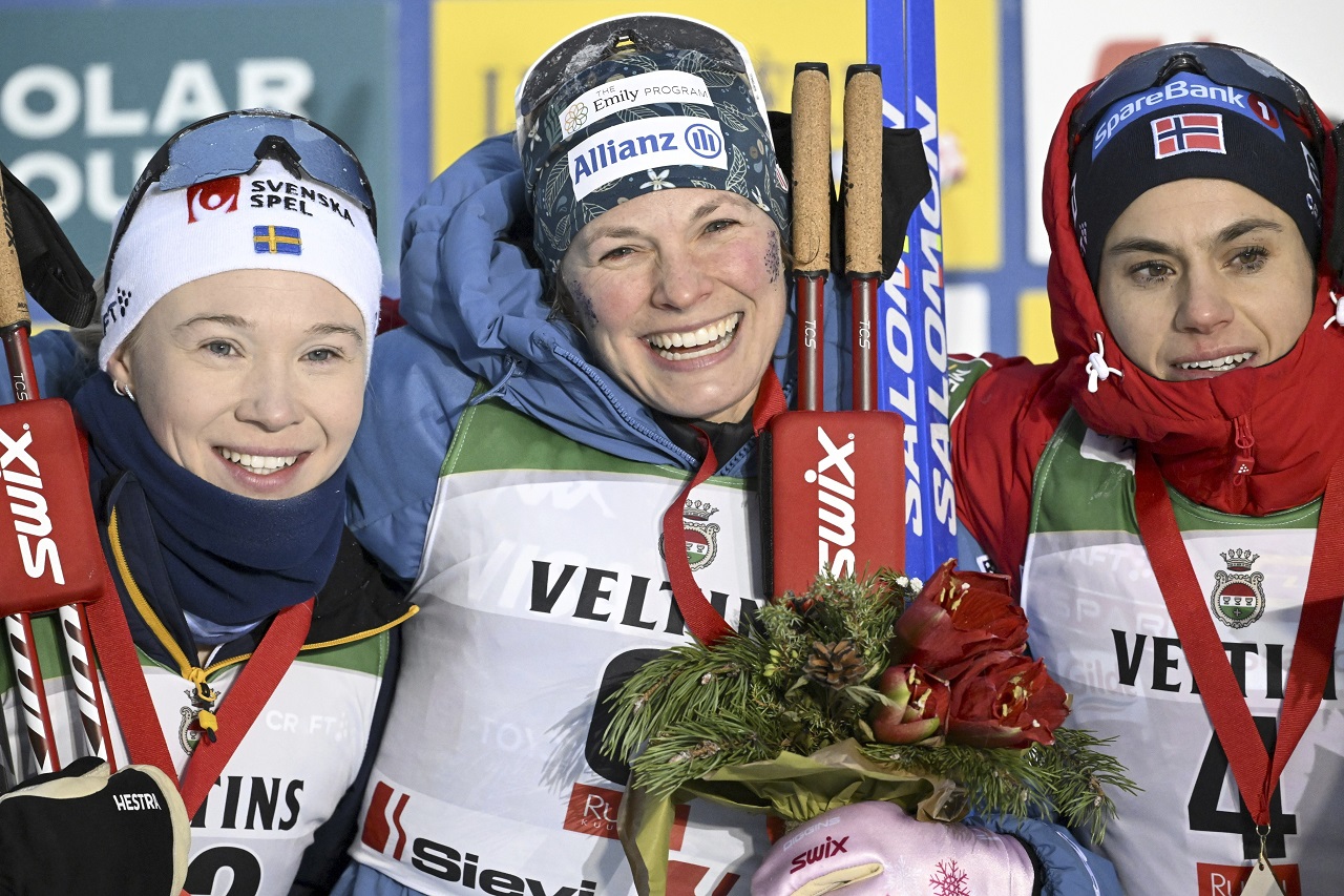 Americká bežkyňana lyžiach Jessie Digginsová (uprostred) pózuje na pódiu po víťazstve v nedeľných pretekoch novej sezóny Svetového pohára v behu na lyžiach na 20 km voľne s hromadným štartom vo fínskom stredisku Ruka v nedeľu 1. decembra 2024