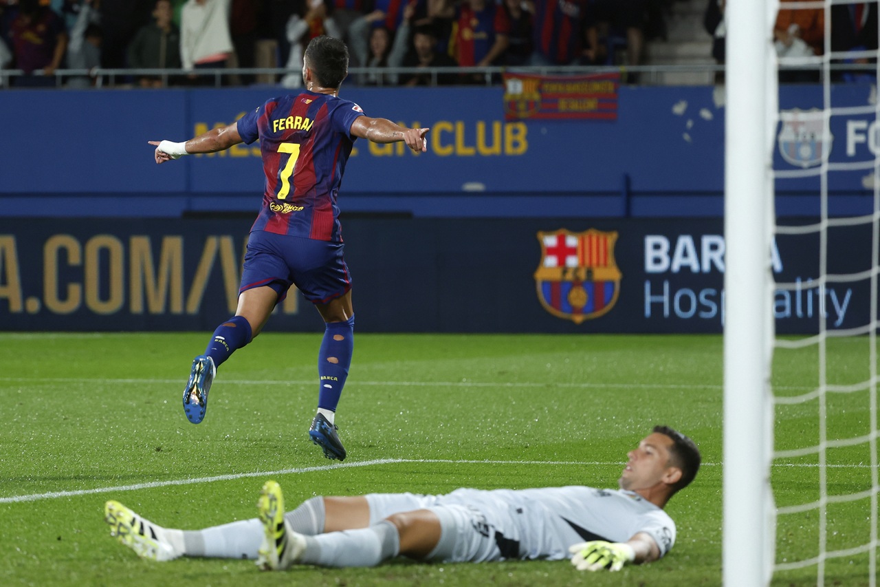 Na snímke hráč Barcelony Ferran Torres sa raduje po strelení úvodného gólu v zápase 5. kola španielskej La Ligy FC Barcelona – FC Getafe / Foto: TASR/AP-Joan Monfort