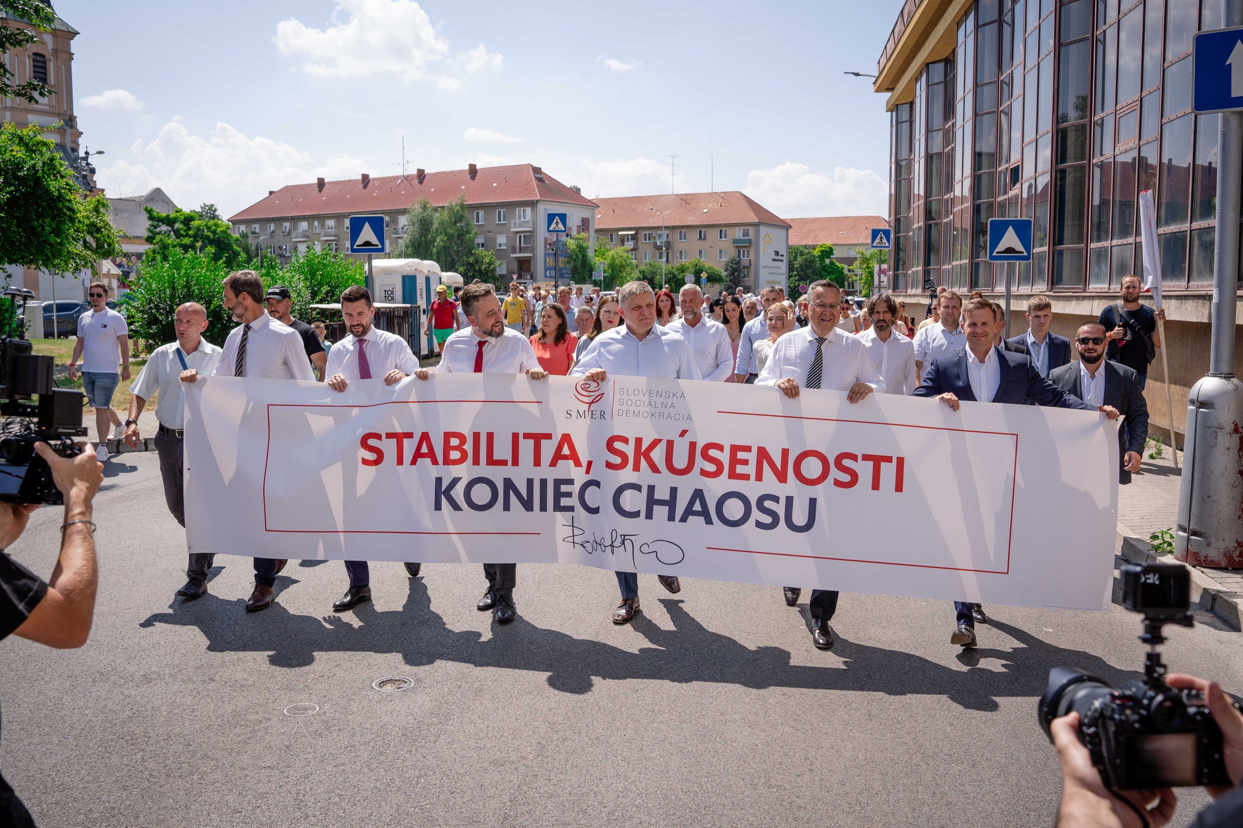 Na snímke predstavitelia strany SMER-SSD – uprostred predseda Robert Fico