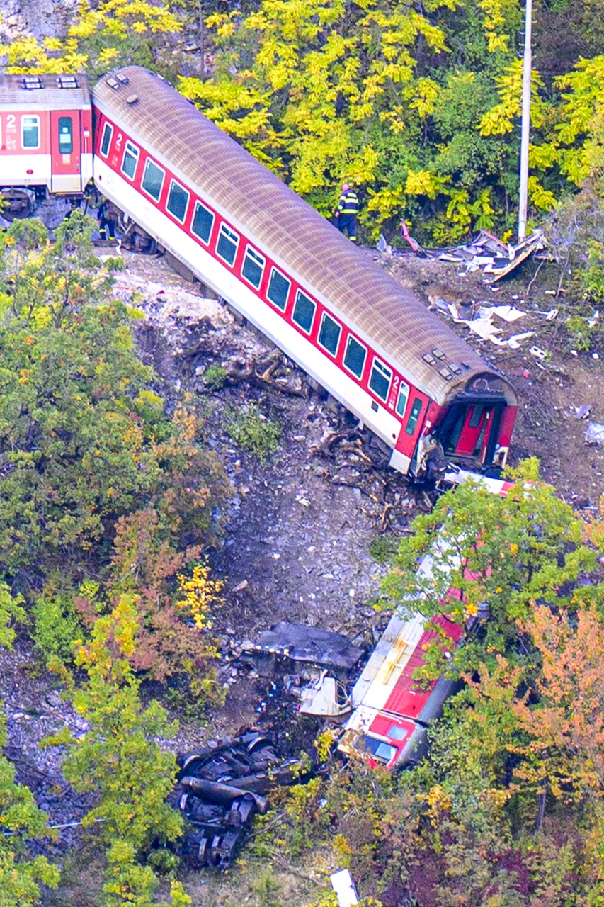 Na snímke vlakový vozeň po zrážke dvoch rýchlikov, ku ktorej došlo v katastri obce Jablonov nad Turňou v okrese Rožňava / Foto: TASR – Veronika Mihaliková