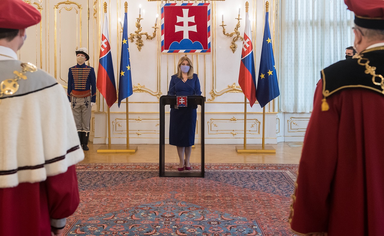 Na snímke prezidentka SR Zuzana Čaputová, ktorá vymenovala dvoch rektorov vysokých škôl Györgyho Juhásza (vpravo) do funkcie rektora Univerzity J. Selyeho v Komárne a Jozefa Habánika (vľavo) do funkcie rektora Trenčianskej univerzity Alexandra Dubčeka v Trenčíne