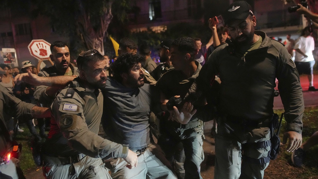 Na snímke policajti zadržiavajú demonštranta počas protestu, ktorý požaduje okamžité prepustenie rukojemníkov zadržiavaných Hamasom a vyzýva izraelskú vládu, aby zmenila svoje rozhodnutie o obsadení mesta Gaza a ďalších oblastí v pásme Gazy / Foto: TASR/AP-Ohad Zwigenberg