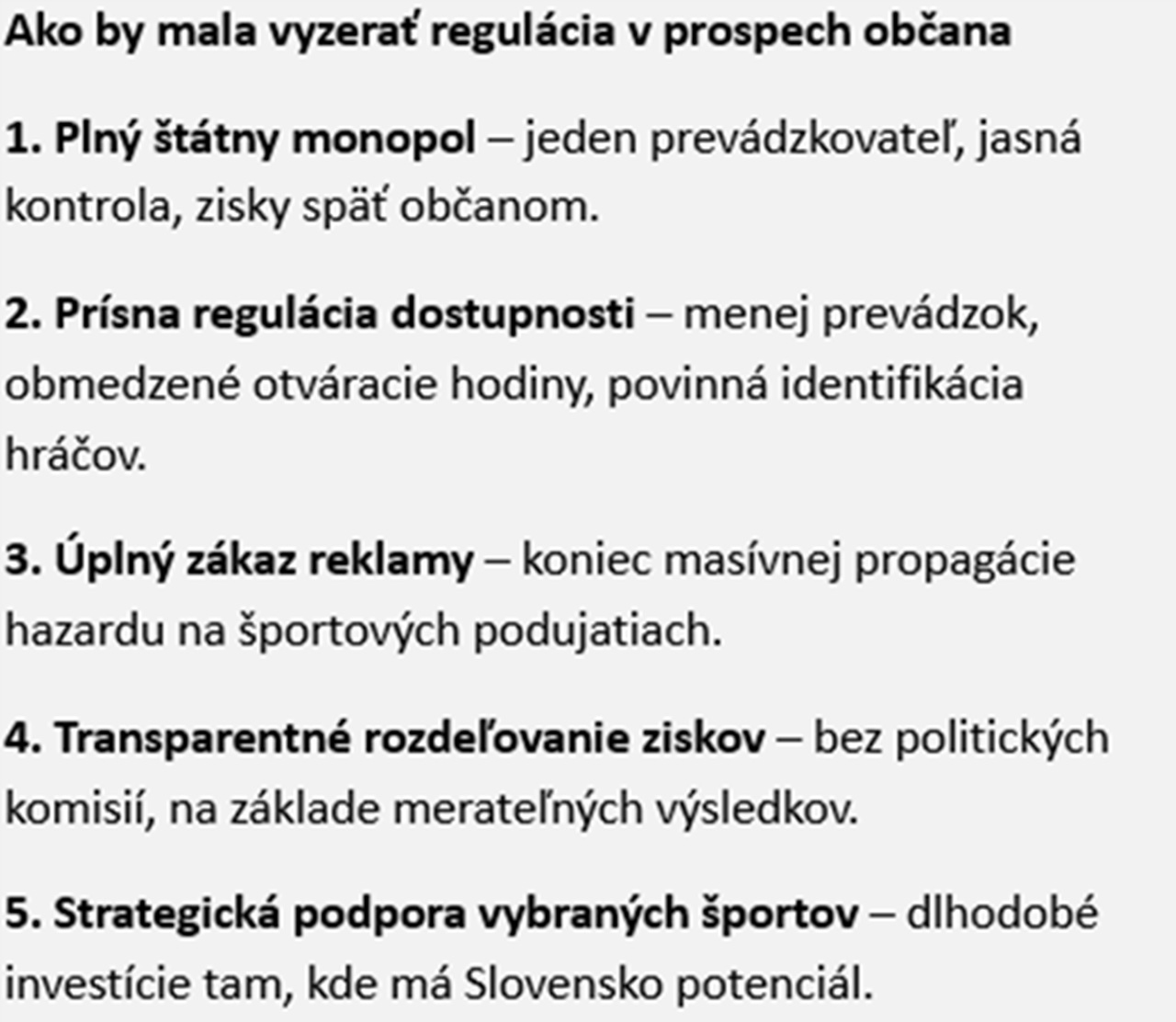 Podľa neho je nevyhnutné vytvoriť legislatívu, ktorá nielen reguluje hazard, ale aj presne určuje, kam pôjdu zisky – na verejnoprospešné účely, a to transparentne.