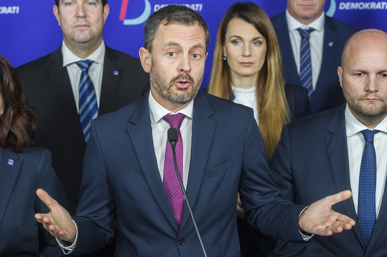 Na snímke v popredí zľava predseda strany Demokrati Eduard Heger a podpredseda strany Demokrati Jaroslav Naď