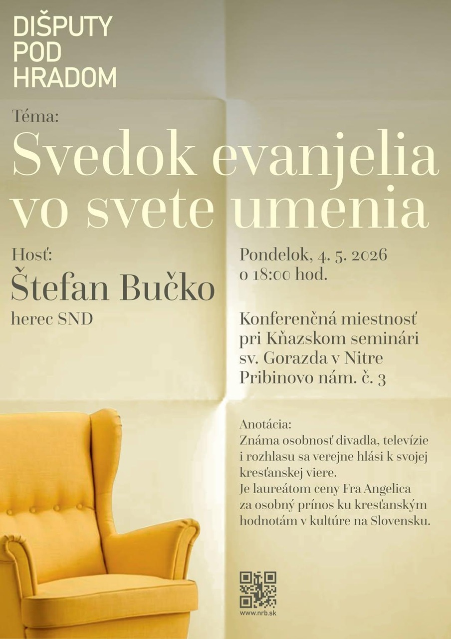 Nitrianske biskupstvo a Kňazský seminár sv. Gorazda v Nitre pozývajú všetkých záujemcov na diskusný večer z cyklu „Dišputy pod hradom“. Hosťom podujatia bude popredný člen činohry Slovenského národného divadla v Bratislave Štefan Bučko