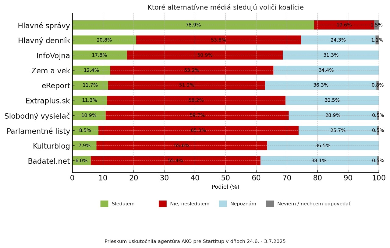 Na portáli Startitup vyšiel veľmi zaujímavý prieskum, ktorý realizovala agentúra AKO o tom, ktoré alternatívne média sledujú voliči koalície. Hlavné správy v ňom štvornásobne predbehlo médium, ktoré sa umiestnilo na druhom mieste a sleduje ich skoro toľko ľudí, ako všetky ostatné nezávislé médiá dokopy