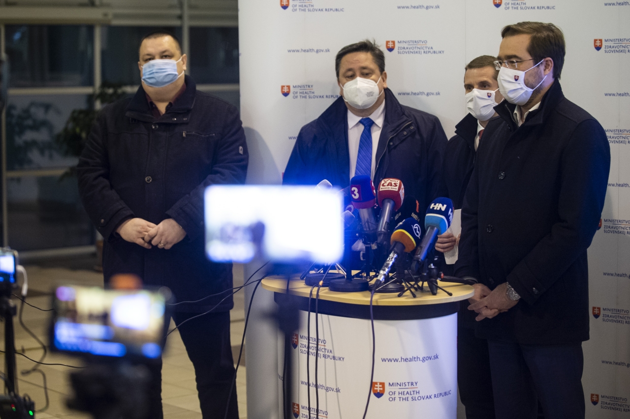 Na snímke sprava minister zdravotníctva SR Marek Krajčí (OĽaNO), štátny tajomník Ministerstva zahraničných vecí a európskych záležitostí SR Martin Klus (SaS), hlavný hraničný Robert Gucký a hlavný hygienik SR Ján Mikas