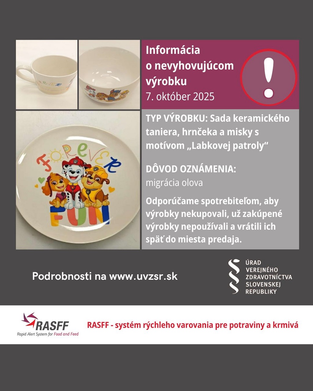 Úrad verejného zdravotníctva (ÚVZ) SR vystríha pred nevyhovujúcim výrobkom, ide o sadu keramického riadu s motívom „Labkovej patroly”. Problémom je migrácia olova. Ako ÚVZ SR ozrejmil, cez systém rýchleho varovania pre potraviny a krmivá RASFF dostal varovné oznámenie z Poľska o nevyhovujúcom výrobku. Predmetná sada obsahuje tri kusy, konkrétne keramický tanier, hrnček a misku.