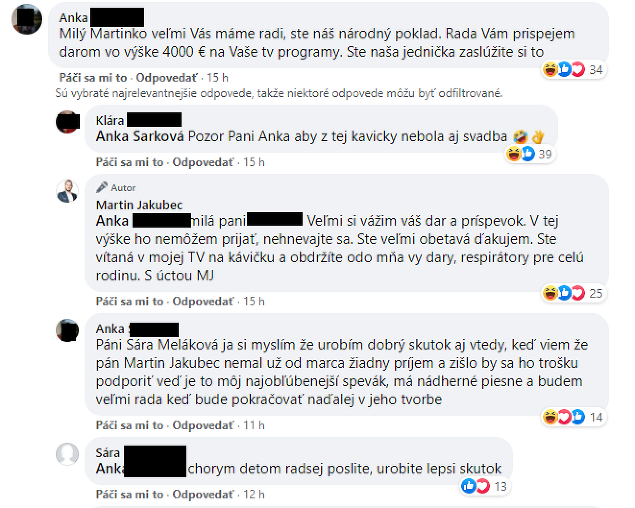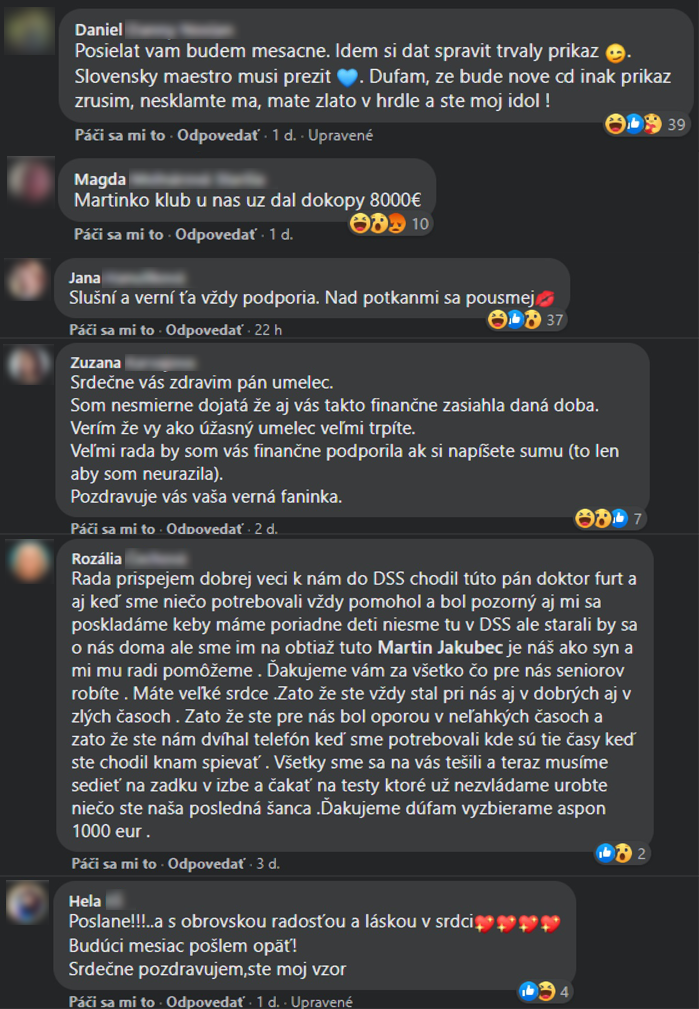 “Našli sa aj tí, ktorí dehonestujú túto aktivitu ako aj moju osobu a chŕlia nenávisť. Z toho si ťažkú hlavu nerobím. Tá ich zožerie sama. Prevažuje ľudské pochopenie nad tým, v akom stave sa nachádza kultúra. Ľudia mi pomáhajú zo srdca a nezištne. Je to veľmi šľachetné a chcem všetkým úprimne poďakovať,” vyhlásil Jakubec. Možno by radšej  mohol chodiť robiť pre dôchodkyne aj súkromné vystúpenia, ak budú mať negatívny test. Zjavne niektoré majú dosť úspor, aby si ho mohli dovoliť v obýbačke. Možno by to bola dôstojnejšia zbierka…