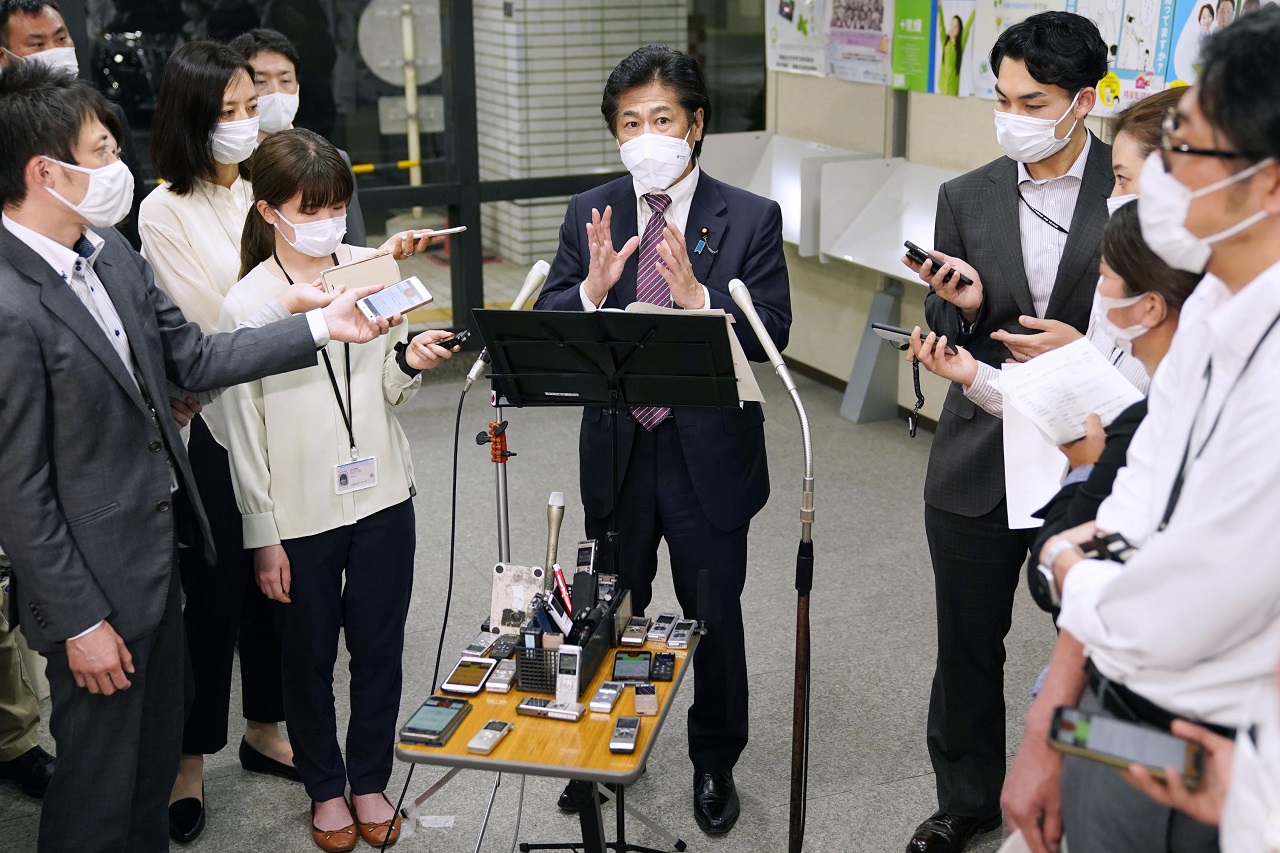 Na snímke japonský minister zdravotníctva Norihisa Tamura (uprostred) hovorí s novinármi po tom, ako ministerstvo zdravotníctva schválilo ďalšie dve vakcíny proti ochoreniu COVID-19 v Tokiu 20. mája 2021