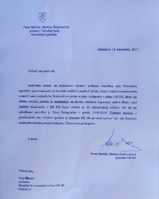 Marček: „Za jeho výroky, ktoré povedal na schôdzi Národnej rady, kde sa opozícia pokúšala odvolať premiéra Pellegriniho, mimochodom, celkom nezmyselnej schôdzi, pretože predsa kým nie je ukončené policajné vyšetrovanie, bolo akékoľvek odvolávanie úplne nemiestne. Na tejto schôdzi si tento človek, ktorý je pre mňa jeden bezcharakterný chrapúň, dovolil pred všetkými poslancami NR SR, divákmi a kamerami povedať, že ja som korupčník, ktorý bude pred každým hlasovaním brať peniaze od koalície za podporu. To povedal o nás všetkých troch odídencoch od Borisa Kollára. Tento chrapúň, ktorý sám je daňový hriešnik, si dovolí hovoriť o mne, že pred každou schôdzou sa nechám podplácať. Len preto, že koalícia má teraz iba 74 hlasov, a teda je v menšine. To však v skutočnosti nie je pravda, pretože kto si pozrie výsledky hlasovaní, tak väčšinou tam vidí, že zákony prešli napríklad 85 hlasmi. Na našich hlasoch nič nestojí. Takto isto o nás všeličo tvrdili, keď sme odišli od Kollára: že určite vstúpime do strany Sieť. Kollár vtedy povedal, že sme dostali ponuku každý po dva milióny eur, Sulík pridal, že to bolo dokonca päť miliónov. Realita je, že sme nič nevzali, nikam sme neprestúpili, nevymenili sme tričká ako vo futbale, ostali sme ako slušní, nezávislí poslanci, ktorí ako jediní hlasujú stále podľa svojho vedomia a svedomia, a jedine za tie zákony, ktoré sú v prospech Slovenska, v prospech slovenského národa a občanov tejto republiky. Teraz podávame spolu s Martinou Šimkovičovou na mandátový a imunitný výbor NR SR podnet na prešetrenie výrokov poslanca NR SR Igora Matoviča za obzvlášť urážlivé a hanlivé výroky ohľadom kupovania našich hlasov pred každým hlasovaním v NR SR, ktoré uviedol na našu adresu počas svojho vystúpenia v pléne NR SR, ktoré nás hlboko urazilo, pretože sa nezakladalo na pravde. Myslím si, že je najvyšší čas, aby sme ho začali riešiť, lebo on je chorý a prajem mu, aby mu pomohli tí správni odborníci.