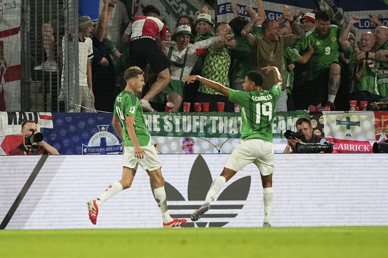 Na snímke fanúšikovia reagujú, keď Isaac Price zo Severného Írska (vľavo) oslavuje po strelení prvého gólu svojho tímu počas kvalifikačného futbalového zápasu skupiny A Majstrovstiev sveta FIFA medzi Nemeckom a Severným Írskom na štadióne RheinEnergieStadion v Kolíne nad Rýnom v Nemecku / Foto: SITA/AP-Martin Meissner