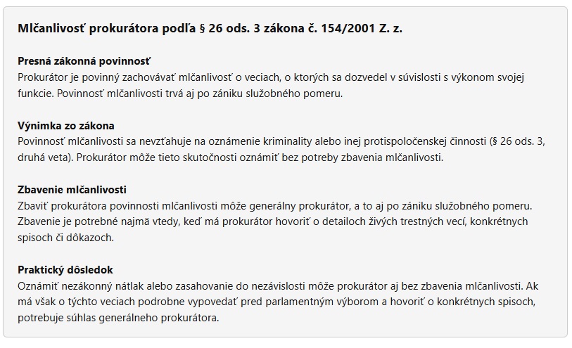 Jadrom sporu je § 26 ods. 3 zákona o prokurátoroch, ktorý síce prikazuje zachovávať mlčanlivosť, ale zároveň z nej vyníma oznamovanie kriminality a inej protispoločenskej činnosti. Tú zákon o prevencii kriminality a inej protispoločenskej činnosti definuje veľmi široko. Nielen ako trestné činy, ale aj priestupky, iné správne delikty či konanie, ktoré pôsobí negatívne na spoločnosť. Upozornenie na nátlak, nezákonné pokyny alebo zasahovanie do nezávislosti preto nemožno považovať za porušenie mlčanlivosti.