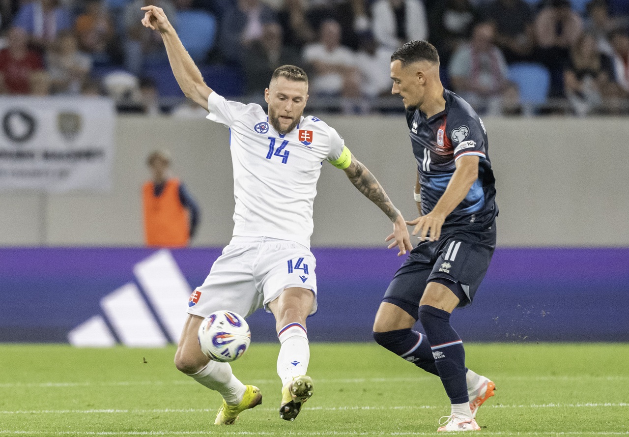 Na snímke zľava kapitán Milan Škriniar (Slovensko) a Edvin Muratovič (Luxembursko) počas zápasu A-skupiny európskej kvalifikácie MS 2026 vo futbale Luxembursko – Slovensko / Foto: TASR-Martin Baumann