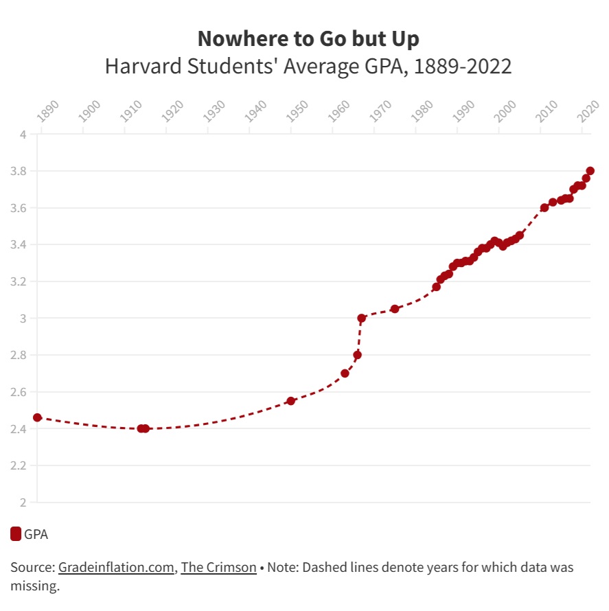 Známková inflace na Harvardu – počet jedničkářů neustále roste. 4,00 je perfektní skóre, které už nelze překonat. Zdroj: článek na serveru Harvard Crimson (2022)
