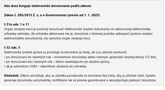 Zákon o e‑Governmente funguje tak, že ak má občan aktivovanú elektronickú schránku, orgán verejnej moci musí doručiť elektronicky. Ak adresát schránku aktivovanú nemá, doručenie zabezpečuje správca modulu elektronického doručovania, nie samotný súd či iný OVM.