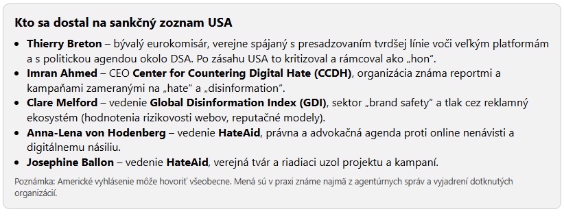 Americké oznámenie síce v základnom texte nevymenúva konkrétne mená, no mená piatich osôb následne potvrdili agentúry a samotná HateAid vo svojom stanovisku. Výber dáva logiku, ak ho čítame cez páky, nie cez nálepky.