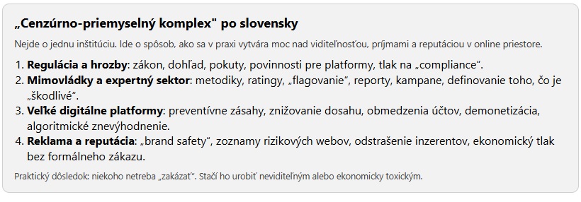 Netreba si pod tým predstavovať nejakú tajnú centrálu. Stačí vnímať vzájomné prepojenie štyroch vrstiev: regulácia a hrozba sankcií, mimovládne alebo expertné hodnotenia a nahlasovanie, rozhodovanie platforiem, a napokon reklamný a reputačný tlak. Výsledkom často nie je formálny zákaz. Výsledkom je tichšie, ale účinné riešenie: zníženie dosahu, demonetizácia, odstrihnutie od inzercie, alebo vytlačenie z viditeľnosti bez toho, aby prebehol súdny proces.