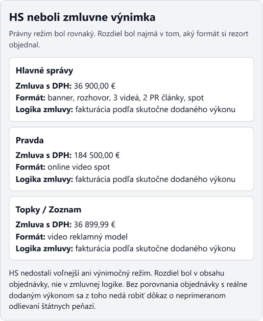 Ak si chce niekto na Hlavných správach postaviť tézu o neštandardnej zmluve, musí to vedieť ukázať. Samotné porovnanie zmlúv to však nepotvrdzuje. Zmluva s HS, zmluva s OUR MEDIA pre Pravdu aj zmluva so Zoznamom pre Topky TV stoja na rovnakom právnom základe, majú rovnaký typ kampane, rovnaký princíp preberacieho protokolu a rovnaké pravidlo, že ak sa nedosiahne dohodnutý objem CPT, fakturuje sa len skutočne dodaný objem. HS teda nemajú iný právny režim ani voľnejšie kontrolné podmienky než veľké médiá.