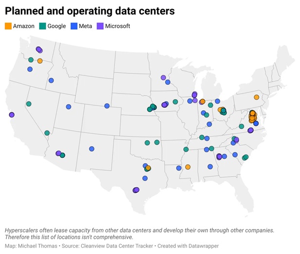 Boom umelej inteligencie je viditeľný aj z vesmíru. Satelitné snímky New Carlisle v štáte Indiana ukazujú, ako sa zelené škvrny poľnohospodárskej pôdy za menej ako rok premenili na priemyselné zóny. Nachádza sa tam už 7 obrovských dátových centier a ďalších 23 je v príprave. Vo vnútri každej z týchto budov sú nekonečné rady počítačových blokov veľkosti chladničky, naplnené čipmi, s pískaním a vŕzganím vykonávajú matematické operácie v nepredstaviteľnom rozsahu. Tieto budovy patria spoločnosti Amazon a vedúca spoločnosť v oblasti umelej inteligencie Anthropic ich využíva na výučbu a spúšťanie svojich modelov. Podľa jedného z odhadov tento kampus dátových centier, ktorý je ešte ďaleko od dokončenia, už teraz potrebuje viac ako 500 megawattov elektrickej energie na napájanie výpočtov. Toľko spotrebujú stovky tisíc amerických domácností.