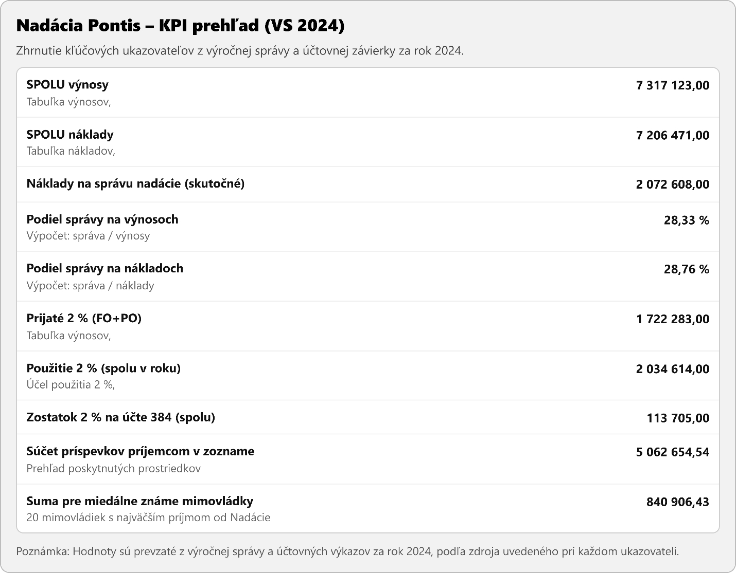Za rok 2024 boli náklady na správu vo výške 2 072 608,00 €. Pri prerozdelenej sume 5 062 654,54 € to znamená, že na každé 1 € „posunuté ďalej“ pripadá približne 0,41 € na správu. Ak to prepočítame na podiel, správa tvorí 28,76 % z celkových výdavkov.