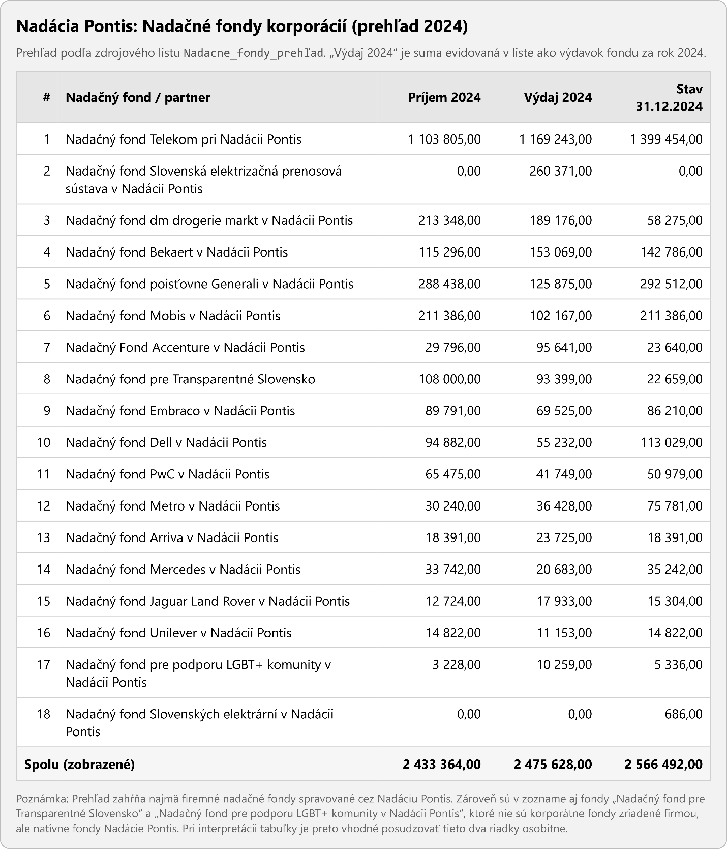 Kľúčovým nástrojom tohto uzla sú nadačné fondy, ktoré Pontis spravuje pre konkrétne firmy a partnerov. Prehľad fondov ukazuje, koľko peňazí do jednotlivých fondov v roku 2024 prišlo, koľko sa v roku 2024 vyčerpalo a aký zostatok zostal na konci roka. Práve tu vidno, ako fungujú firemné „potrubia“ v praxi.