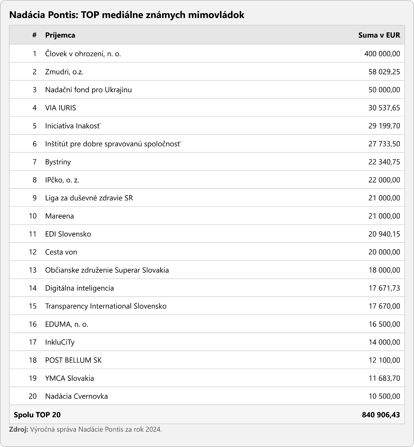 Osobitný význam má rebríček mediálne exponovaných mimovládok. Príjem TOP 20 takto označených subjektov predstavuje spolu 840 906,43 €. Aj keby sa niekto chcel tváriť, že „exponovanosť“ je len nálepka, čísla ukazujú podstatu. Vplyv sa nerobí len cez jednu kampaň, robí sa cez dlhodobý tok prostriedkov, ktorý drží určitý okruh organizácií nad vodou a posilňuje ich kapacity.
