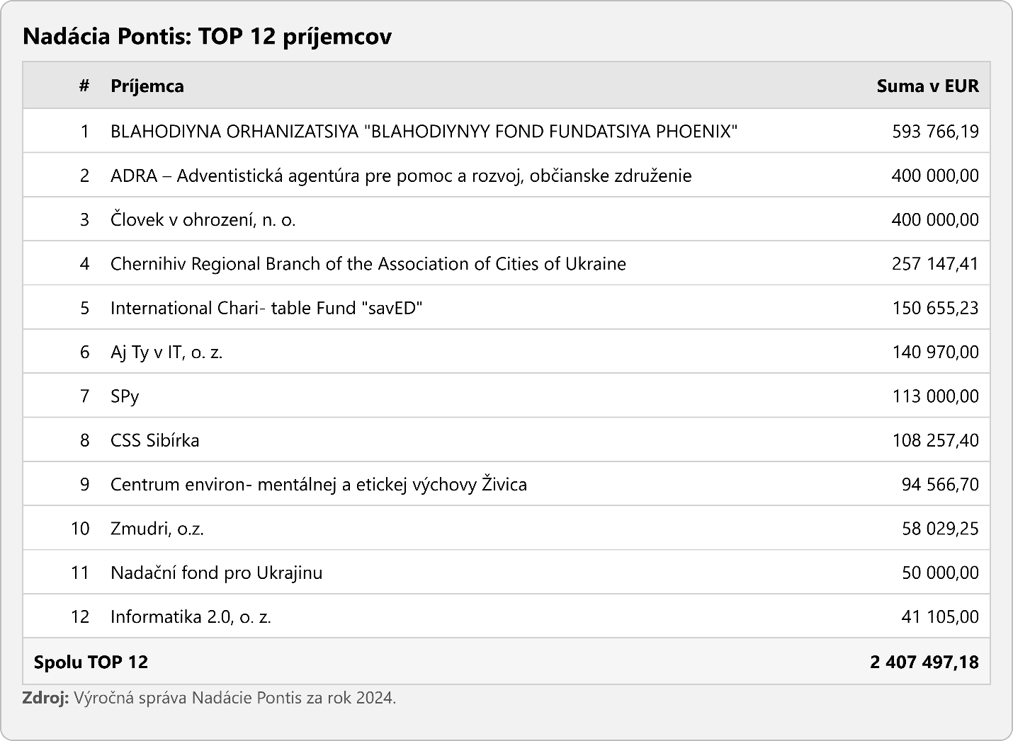 V rebríčku TOP príjemcov (prvých 12) ide spolu o 2 407 497,18 €. To je suma, ktorá sama osebe ukazuje, že uzol nie je okrajová charita, ale stabilný finančný mechanizmus.