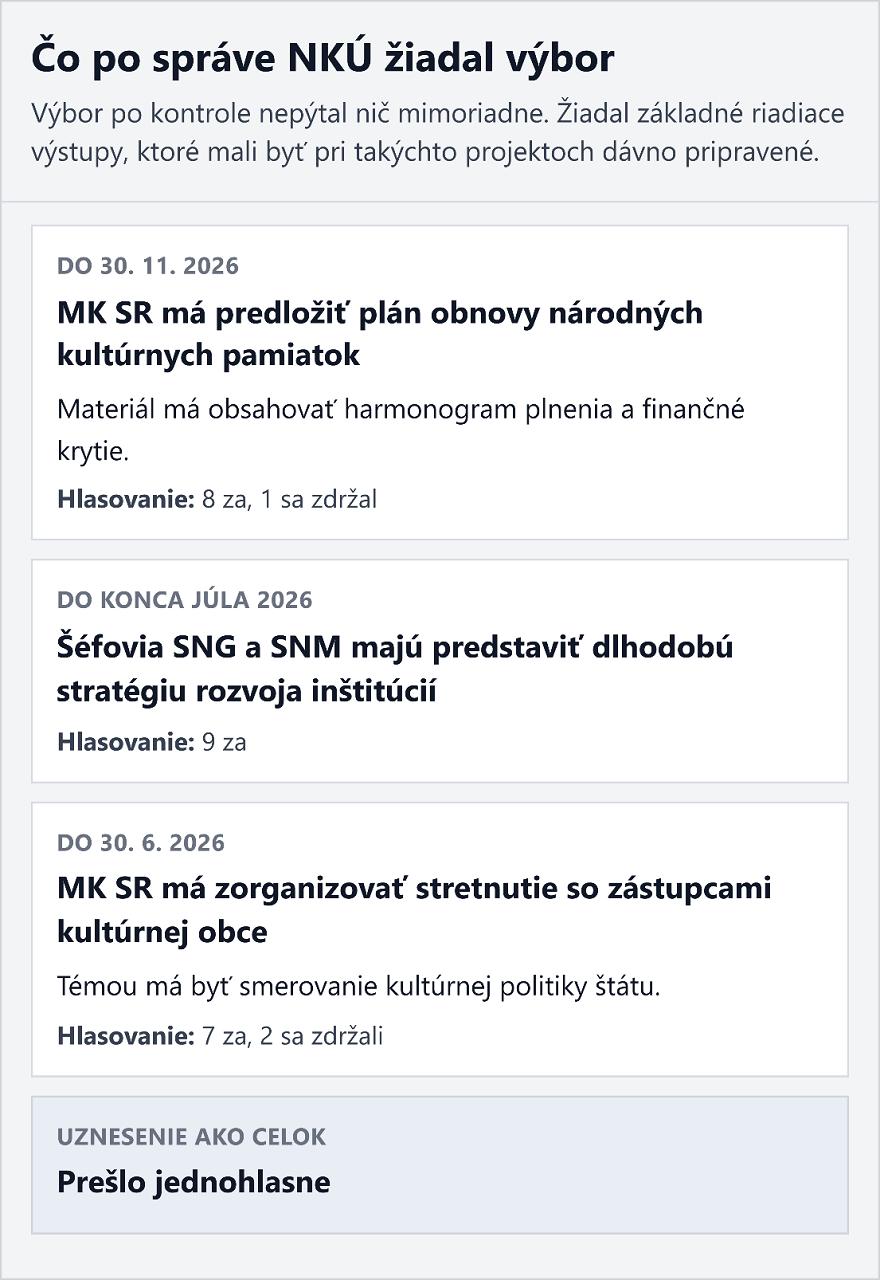 Kultúrny výbor tento týždeň neprerokoval len starú správu NKÚ. Otvoril obraz štátu, ktorý mal peniaze aj čas, no pri obnove vlastných pamiatok dlhodobo zlyhával v riadení. To je podstatnejšie než prestrelka medzi koalíciou a opozíciou o zodpovednosti za tento stav. Keď musí parlamentný výbor po kontrole žiadať od ministerstva kultúry plán obnovy s harmonogramom a finančným krytím, problém už nie je len v kultúre. Je v tom, ako štát riadi vlastné priority. Aj samotný NKÚ pritom odporučil výboru zaviazať ministerstvo, aby takýto materiál predložilo.
