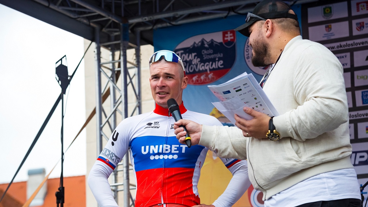 Na snímke slovenský cyklista Lukáš Kubiš z tímu Unibet Tietema Rockets (vľavo) v drese najlepšieho Slováka po 1. etape 69. ročníka cyklistických pretekov Okolo Slovenska v Bardejove / Foto: SITA/Ján Melicher/Okolo Slovenska